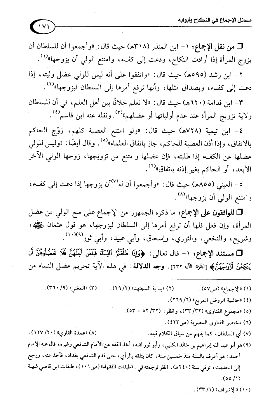 1 - ابن المنذر (318 هـ) حيث قال: "وأجمعوا أن للسلطان أن يزوج المرأة إذا أرادت النكاح، ودعت إلى كفء، وامتنع الولي أن يزوجها" (¬1).