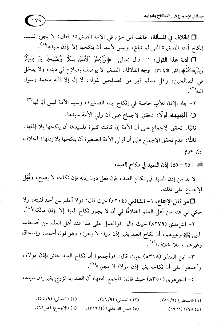 3 - ابن المنذر (318 هـ) حيث قال: "وأجمعوا أن نكاح العبد جائز بإذن مولاه، وأجمعوا على أن نكاحه بغير إذن مولاه لا يجوز" (¬6).