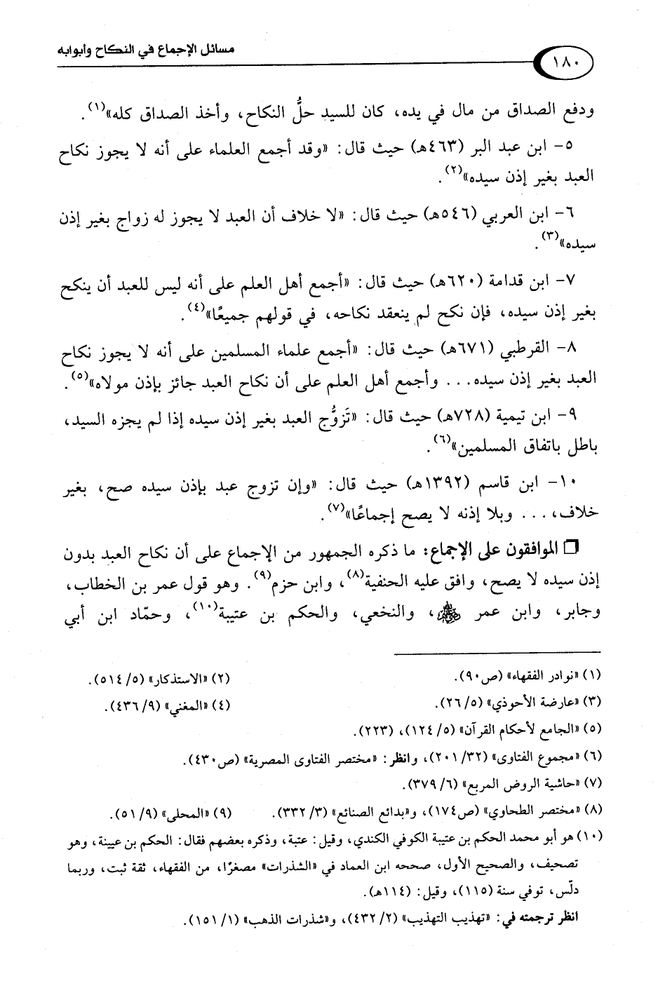 7 - ابن قدامة (620 هـ) حيث قال: "أجمع أهل العلم على أنه ليس للعبد أن ينكح بغير إذن سيده، فإن نكح لم ينعقد نكاحه، في قولهم جميعًا" (¬4).
