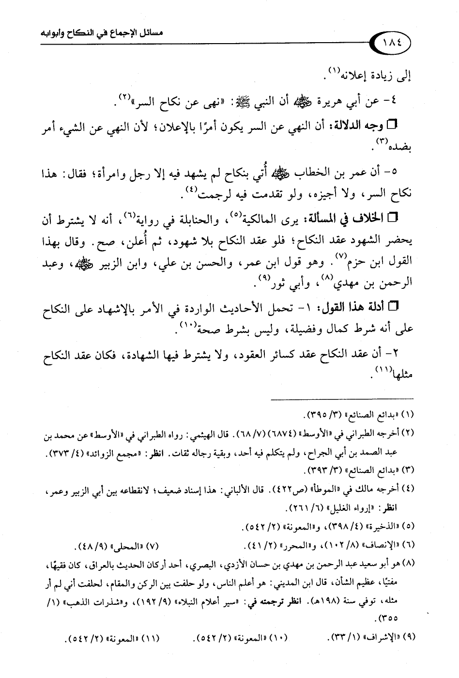• الخلاف في المسألة: يرى المالكية (¬5)، والحنابلة في رواية (¬6)، أنه لا يشترط أن يحضر الشهود عقد النكاح؛ فلو عقد النكاح بلا شهود، ثم أُعلن، صح. وقال بهذا القول ابن حزم (¬7). وهو قول ابن عمر، والحسن بن علي، وابن الزبير -رضي اللَّه عنه-، وعبد الرحمن بن مهدي (¬8)، وأبي ثور (¬9).