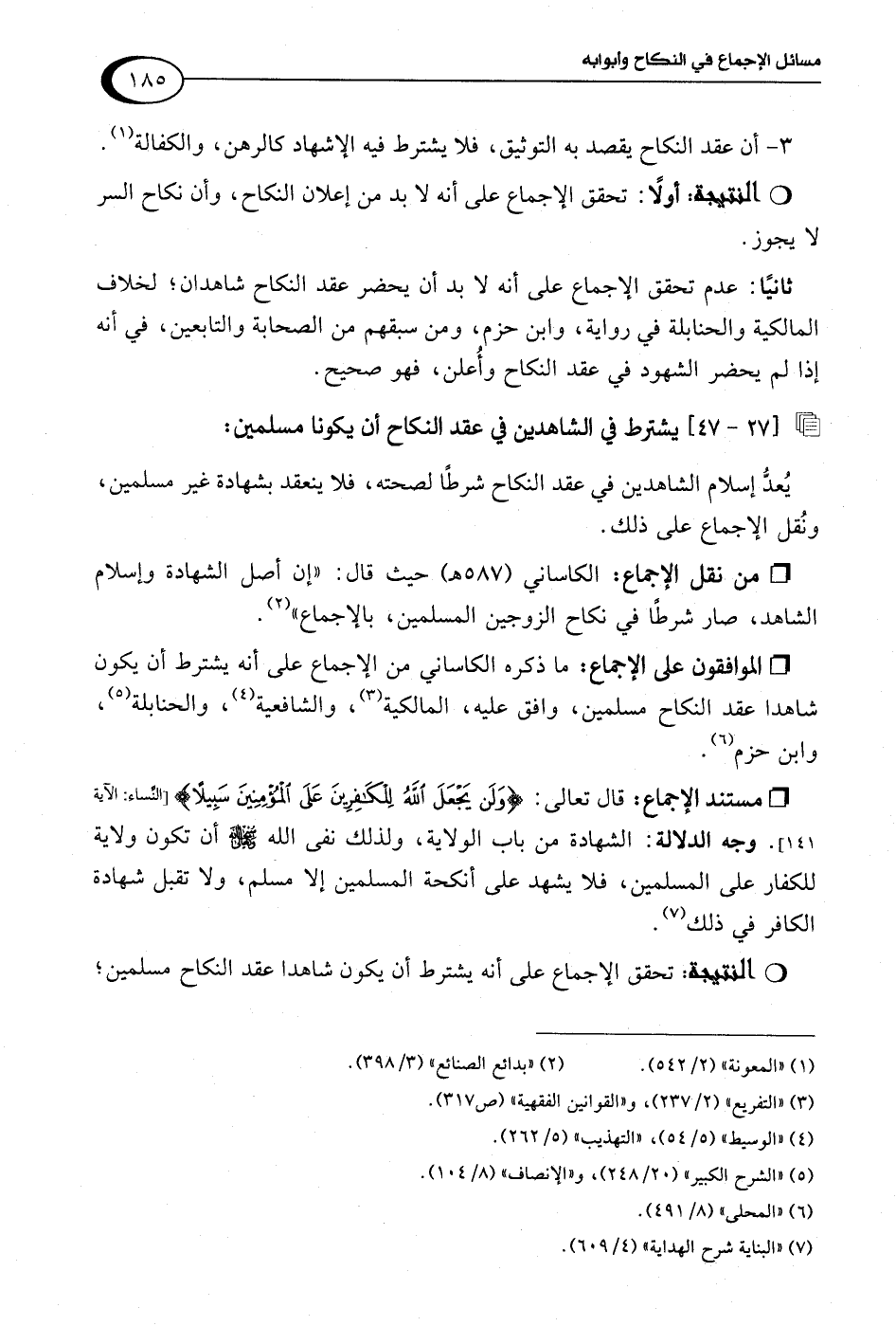 • الموافقون على الإجماع: ما ذكره الكاساني من الإجماع على أنه يشترط أن يكون شاهدا عقد النكاح مسلمين، وافق عليه، المالكية (¬3)، والشافعية (¬4)، والحنابلة (¬5)، وابن حزم (¬6).