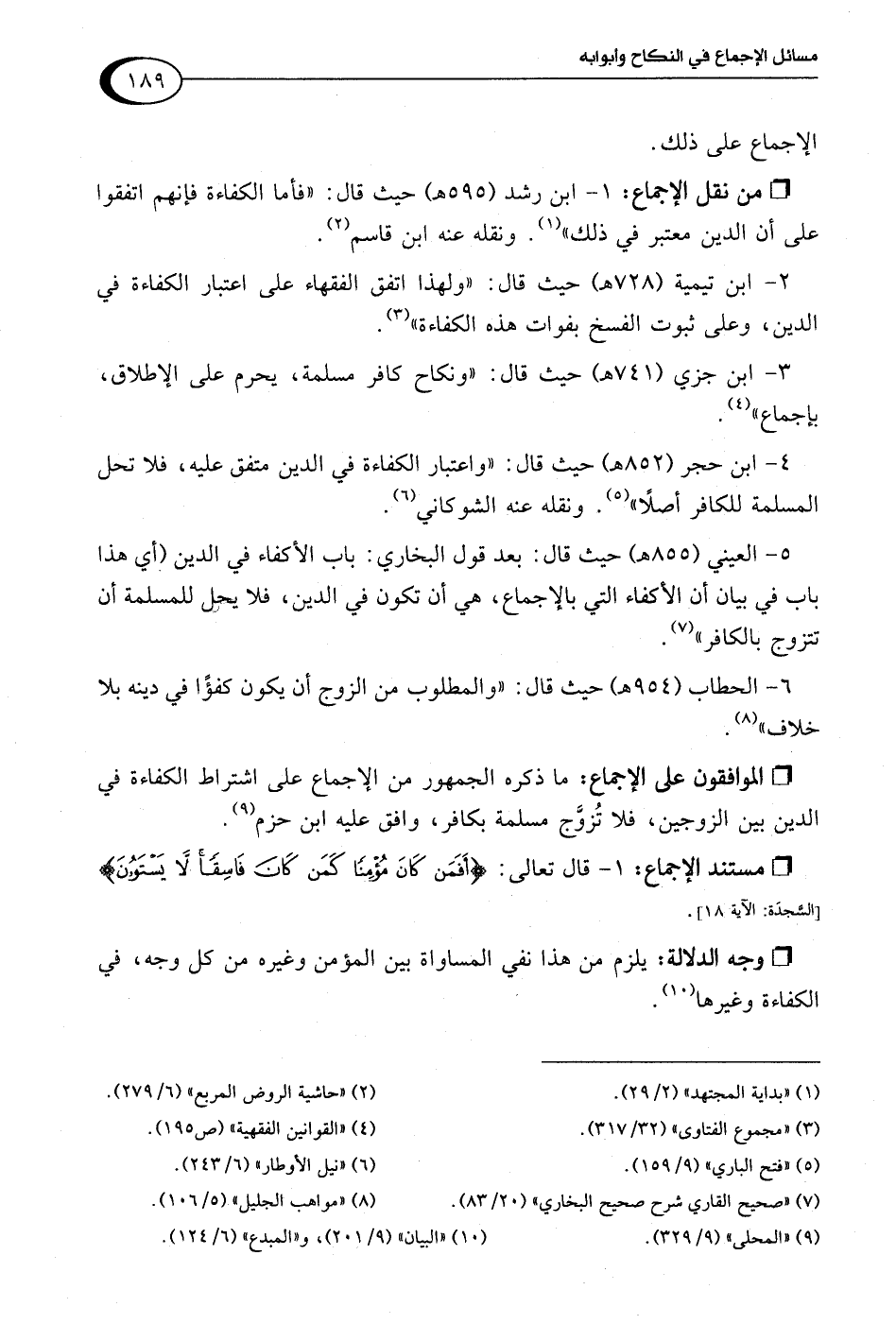 4 - ابن حجر (852 هـ) حيث قال: "واعتبار الكفاءة في الدين متفق عليه، فلا تحل المسلمة للكافر أصلًا" (¬5). ونقله عنه الشوكاني (¬6).