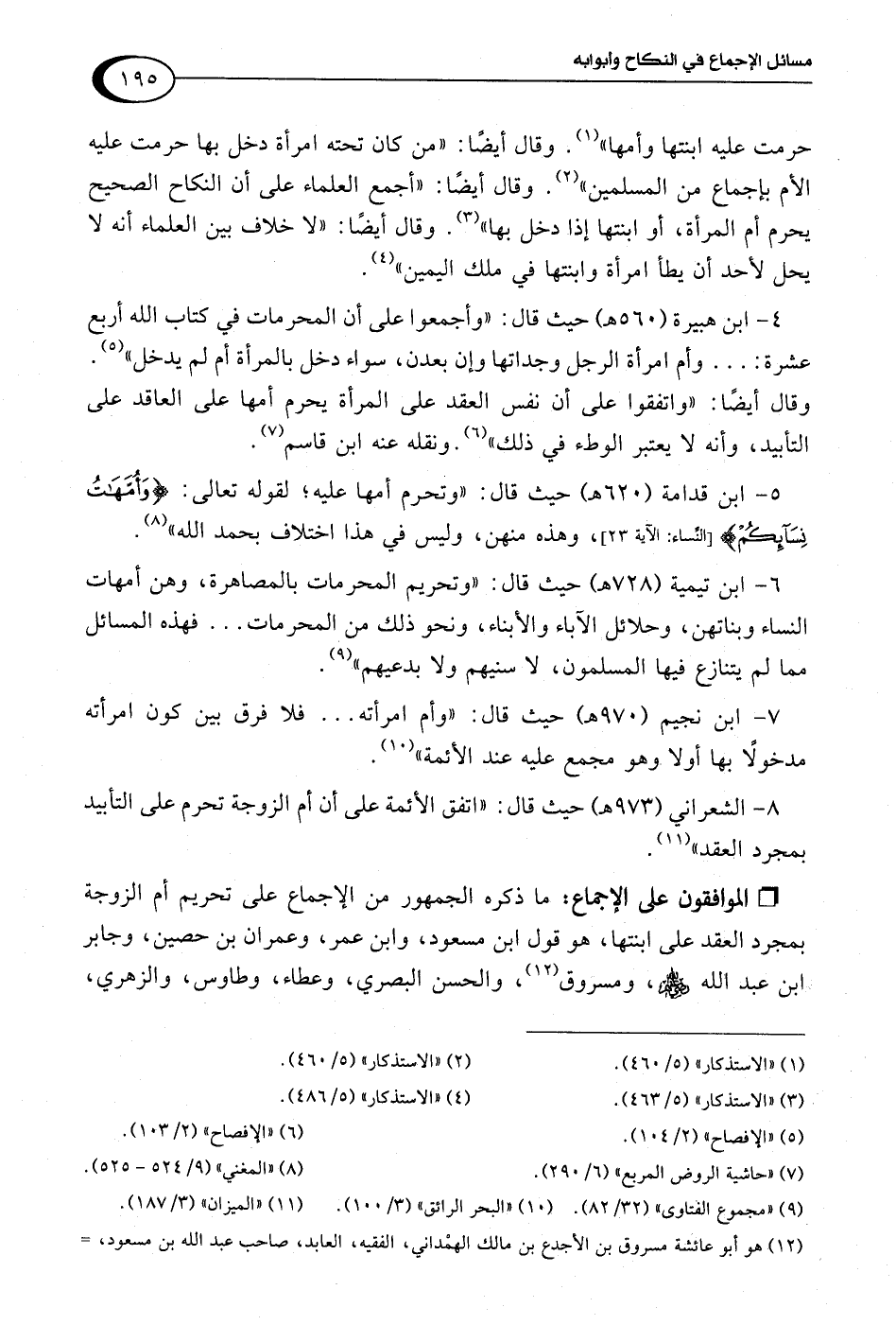 8 - الشعراني (973 هـ) حيث قال: "اتفق الأئمة على أن أم الزوجة تحرم على التأبيد بمجرد العقد" (¬11).