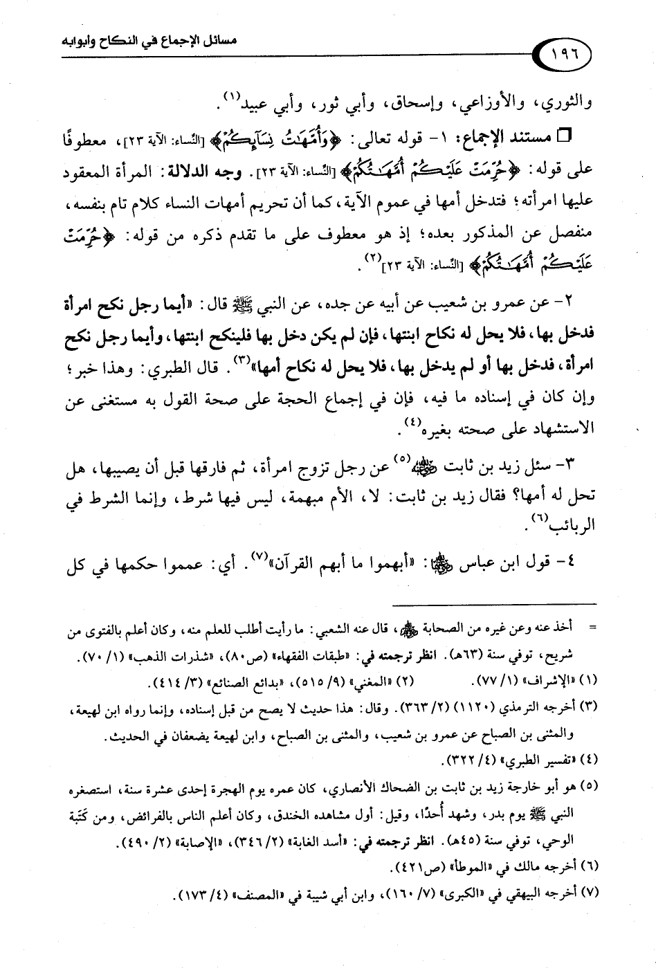3 - سئل زيد بن ثابت -رضي اللَّه عنه- (¬5) عن رجل تزوج امرأة، ثم فارقها قبل أن يصيبها، هل تحل له أمها؟ فقال زيد بن ثابت: لا، الأم مبهمة، ليس فيها شرط، وإنما الشرط في الربائب (¬6).