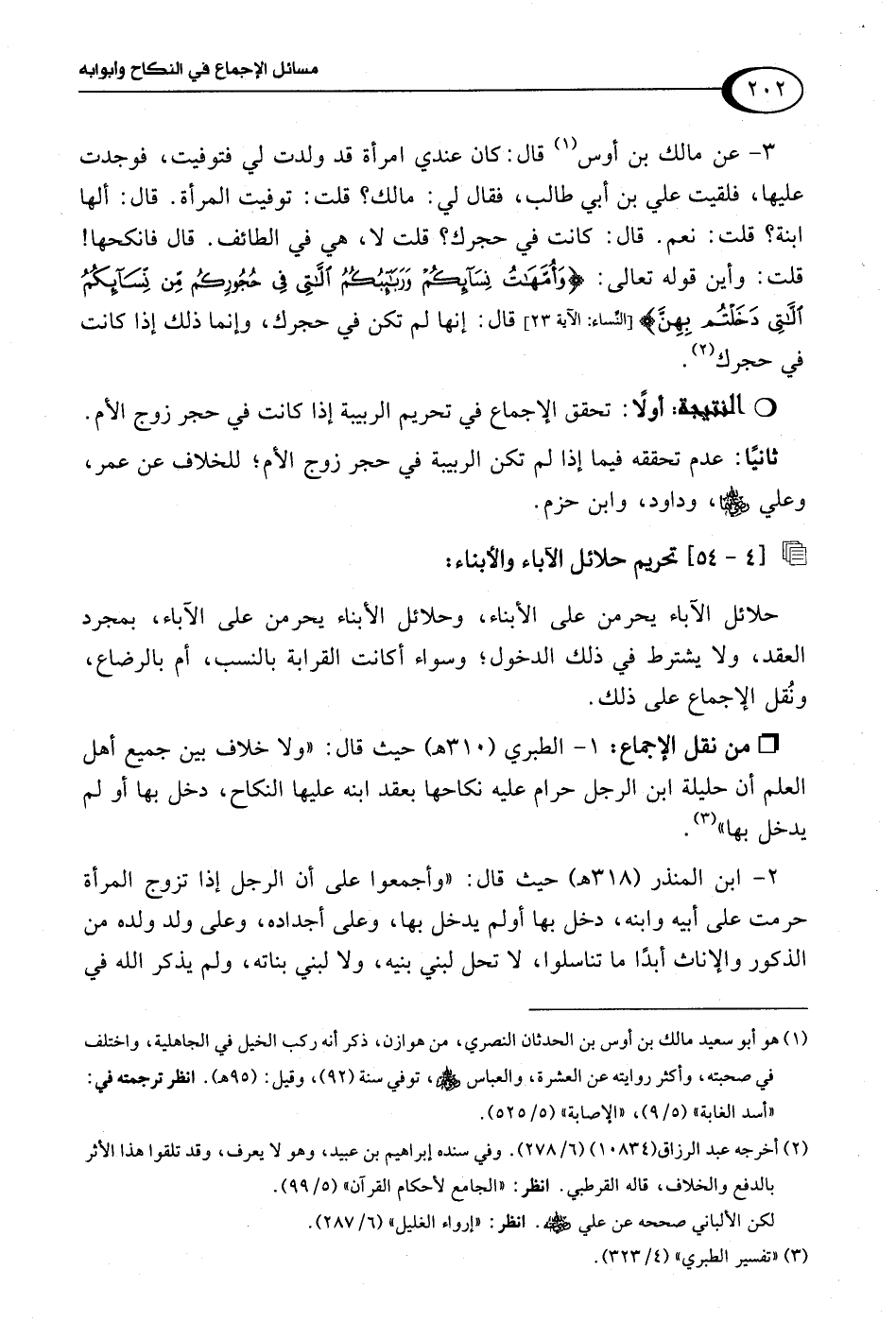 2 - ابن المنذر (318 هـ) حيث قال: "وأجمعوا على أن الرجل إذا تزوج المرأة حرمت على أبيه وابنه، دخل بها أو لم يدخل بها، وعلى أجداده، وعلى ولد ولده من الذكور والإناث أبدًا ما تناسلوا، لا تحل لبني بنيه، ولا لبني بناته، ولم يذكر اللَّه في