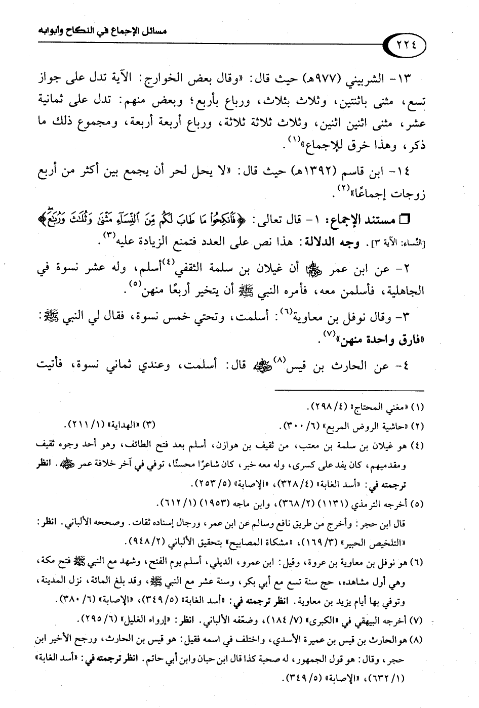 14 - ابن قاسم (1392 هـ) حيث قال: "لا يحل لحر أن يجمع بين أكثر من أربع زوجات إجماعًا" (¬2).