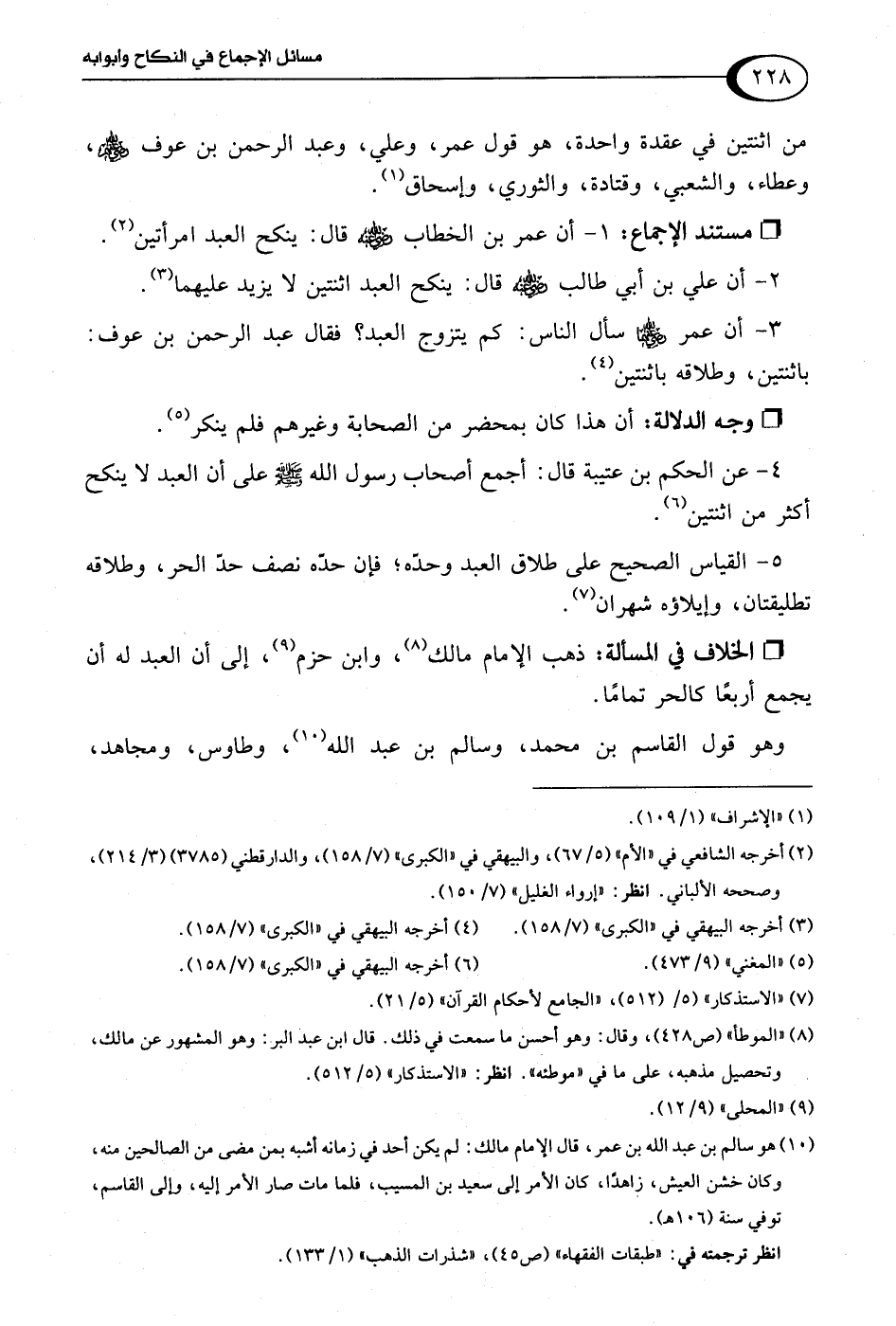 4 - عن الحكم بن عتيبة قال: أجمع أصحاب رسول اللَّه -صلى اللَّه عليه وسلم- على أن العبد لا ينكح أكثر من اثنتين (¬6).