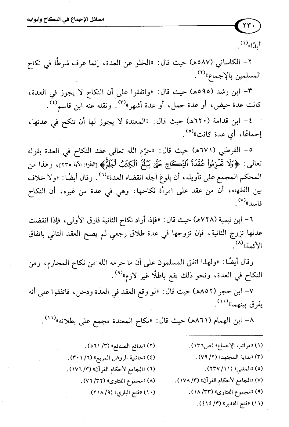 8 - ابن الهمام (861 هـ) حيث قال: "نكاح المعتدة مجمع على بطلانه" (¬11).