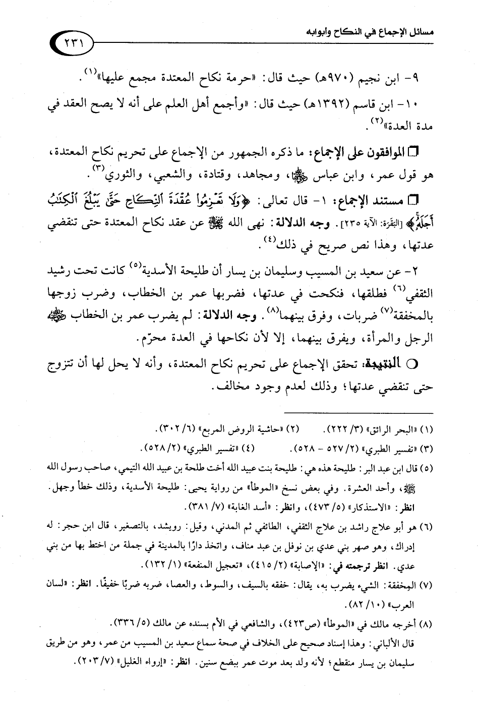 10 - ابن قاسم (1392 هـ) حيث قال: "وأجمع أهل العلم على أنه لا يصح العقد في مدة العدة" (¬2).