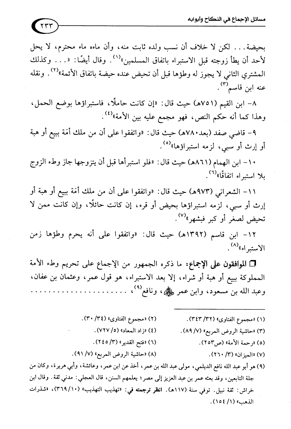 8 - ابن القيم (751 هـ) حيث قال: "إن كانت حاملًا، فاستبراؤها بوضع الحمل، وهذا كما أنه حكم النص، فهو مجمع عليه بين الأمة" (¬4).