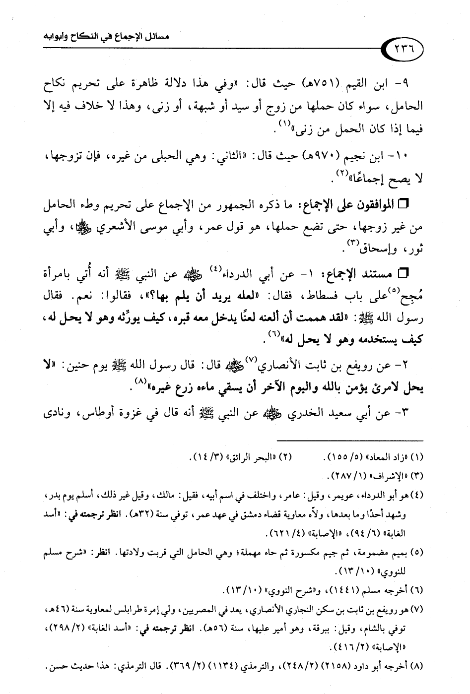 9 - ابن القيم (751 هـ) حيث قال: "وفي هذا دلالة ظاهرة على تحريم نكاح الحامل، سواء كان حملها من زوج أو سيد أو شبهة، أو زنى، وهذا لا خلاف فيه إلا فيما إذا كان الحمل من زنى" (¬1).