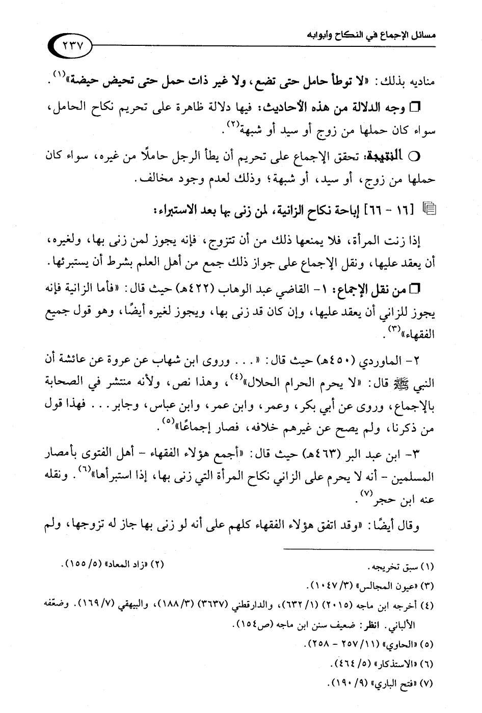 3 - ابن عبد البر (463 هـ) حيث قال: "أجمع هؤلاء الفقهاء -أهل الفتوى بأمصار المسلمين- أنه لا يحرم على الزاني نكاح المرأة التي زنى بها، إذا استبرأها" (¬6). ونقله عنه ابن حجر (¬7).