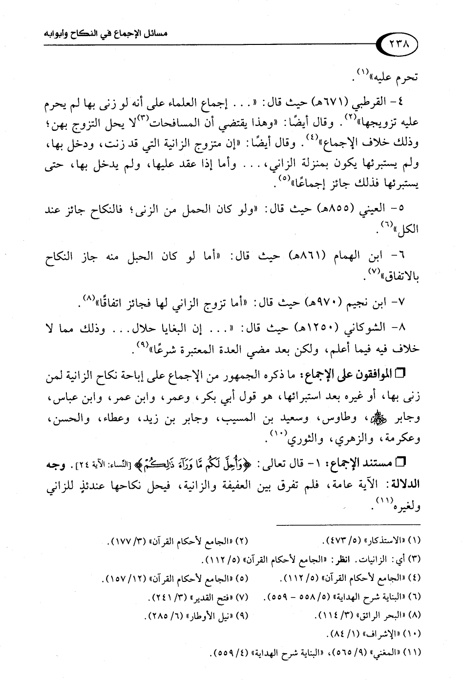 4 - القرطبي (671 هـ) حيث قال: ". . . إجماع العلماء على أنه لو زنى بها لم يحرم عليه تزويجها" (¬2). وقال أيضًا: "وهذا يقتضي أن المسافحات (¬3) لا يحل التزوج بهن؛ وذلك خلاف الإجماع" (¬4). وقال أيضًا: "إن متزوج الزانية التي قد زنت، ودخل بها، ولنم يستبرئها يكون بمنزلة الزاني، . . . وأما إذا عقد عليها، ولم يدخل بها، حتى يستبرئها فذلك جائز إجماعًا" (¬5).