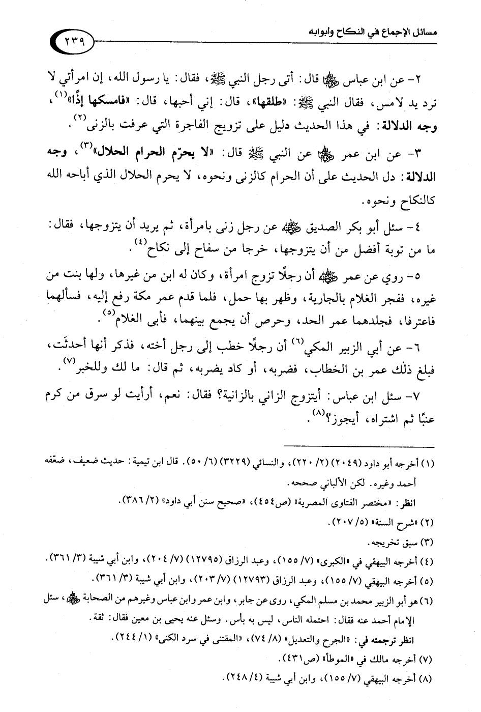 7 - سئل ابن عباس: أيتزوج الزاني بالزانية؟ فقال: نعم، أرأيت لو سرق من كرم عنبًا ثم اشتراه، أيجوز؟ (¬8).