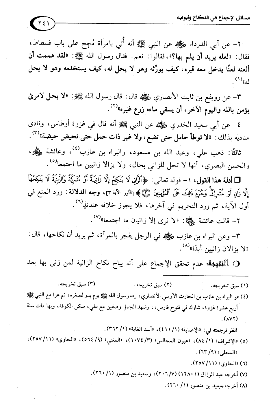 3 - وعن البراء بن عازب -رضي اللَّه عنه- في الرجل يفجر بالمرأة، ثم يريد أن نكاحها، قال: "لا يزالان زانيين أبدًا" (¬8).Rعدم تحقق الإجماع على أنه يباح نكاح الزانية لمن زنى بها بعد