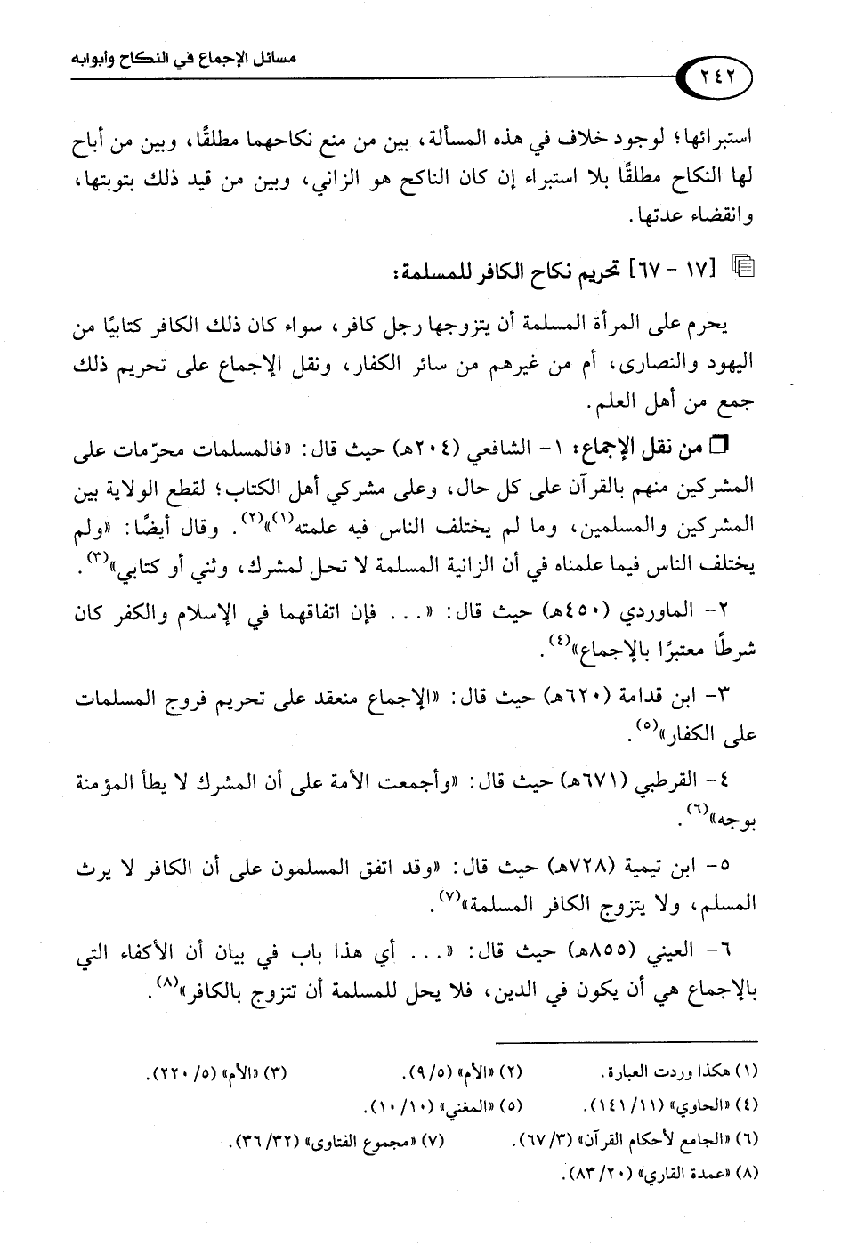 5 - ابن تيمية (728 هـ) حيث قال: "وقد اتفق المسلمون على أن الكافر لا يرث المسلم، ولا يتزوج الكافر المسلمة" (¬7).
