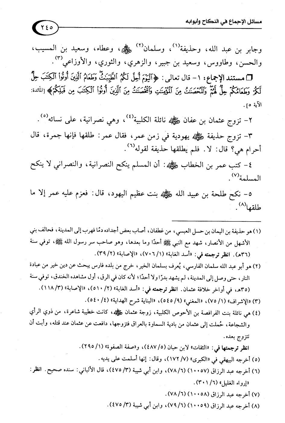 4 - كتب عمر بن الخطاب -رضي اللَّه عنه-: أن المسلم ينكح النصرانية، والنصراني لا ينكح المسلمة (¬7).