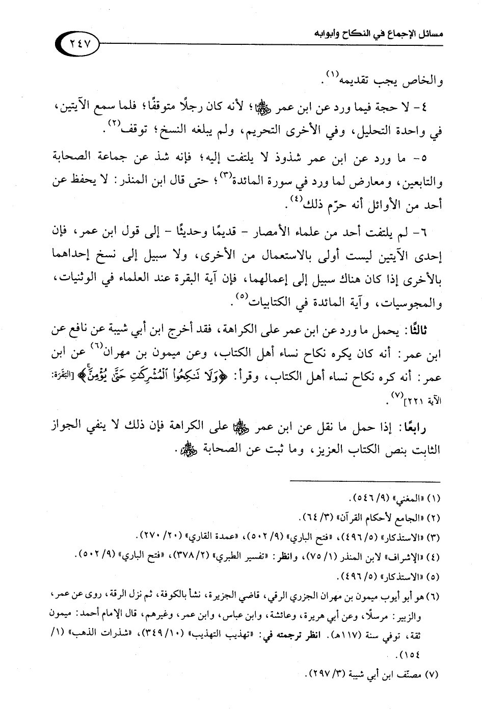 ثالثًا: يحمل ما ورد عن ابن عمر على الكراهة، فقد أخرج ابن أبي شيبة عن نافع عن ابن عمر: أنه كان يكره نكاح نساء أهل الكتاب، وعن ميمون بن مهران (¬6) عن ابن عمر: أنه كره نكاح نساء أهل الكتاب، وقرأ: {وَلَا تَنْكِحُوا الْمُشْرِكَاتِ حَتَّى يُؤْمِنَّ} [البقرة: 221] (¬7).