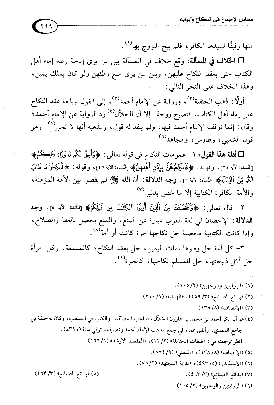 (¬4) هو أبو بكر أحمد بن محمد بن هارون الخلّال، صاحب المصنّفات والكتب في المذهب، وكان له حلقة في جامع المهدي، وأنفق عمره في جمع مذهب الإمام أحمد وتصنيفه، توفي سنة (311 هـ).