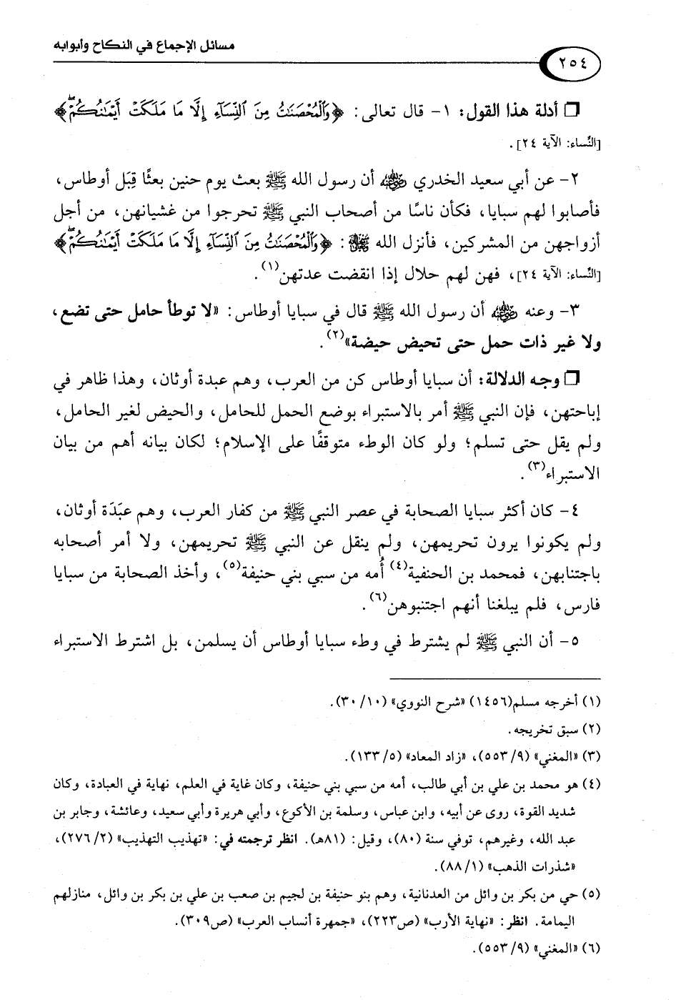 4 - كان أكثر سبايا الصحابة في عصر النبي -صلى اللَّه عليه وسلم- من كفار العرب، وهم عبَدَة أوثان، ولم يكونوا يرون تحريمهن، ولم ينقل عن النبي -صلى اللَّه عليه وسلم- تحريمهن، ولا أمر أصحابه باجتنابهن، فمحمد بن الحنفية (¬4) أُمه من سبي بني حنيفة (¬5)، وأخذ الصحابة من سبايا فارس، فلم يبلغنا أنهم اجتنبوهن (¬6).