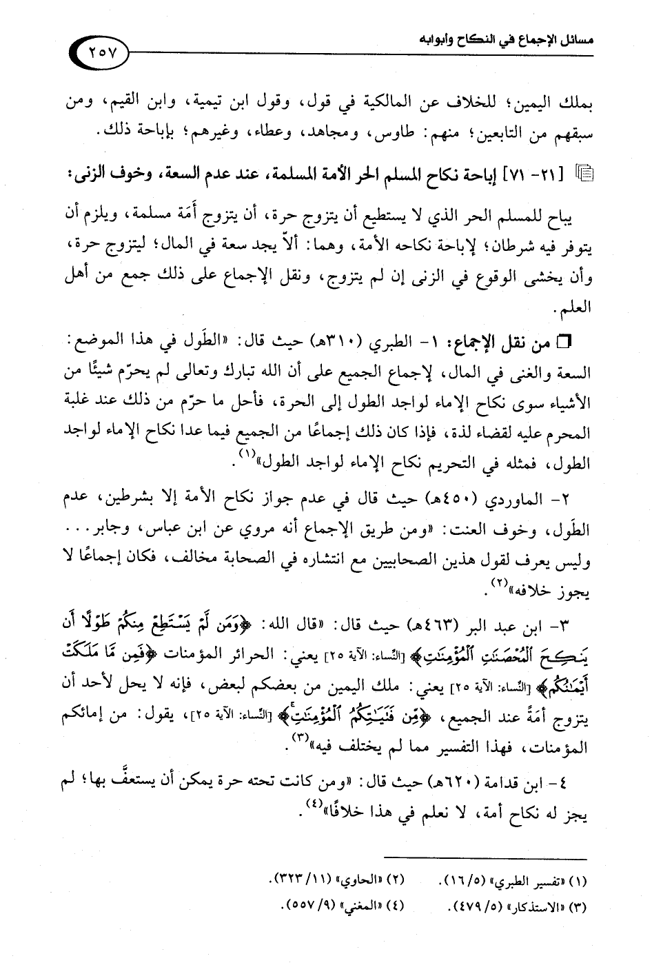 1 - الطبري (310 هـ) حيث قال: "الطَول في هذا الموضع: السعة والغنى في المال، لإجماع الجميع على أن اللَّه تبارك وتعالى لم يحرّم شيئًا من الأشياء سوى نكاح الإماء لواجد الطول إلى الحرة، فأحل ما حرّم من ذلك عند غلبة المحرم عليه لقضاء لذة، فإذا كان ذلك إجماعًا من الجميع فيما عدا نكاح الإماء لواجد الطول، فمثله في التحريم نكاح الإماء لواجد الطول" (¬1).