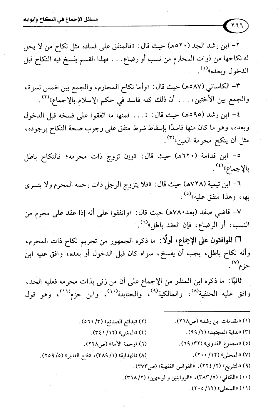 3 - الكاساني (587 هـ) حيث قال: "وأما نكاح المحارم، والجمع بين خمس نسوة، والجمع بين الأختين، . . . أن ذلك كله فاسد في حكم الإسلام بالإجماع" (¬2).