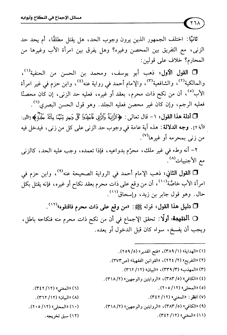 • القول الثاني: ذهب الإمام أحمد في الرواية الصحيحة عنه (¬9)، وابن حزم في امرأة الأب خاصَّة (¬10)، أن من وقع على ذات محرم بعقد نكاح أو غيره، فإنه يقتل بكل حال. وهو قول جابر بن زيد، وإسحاق (¬11).