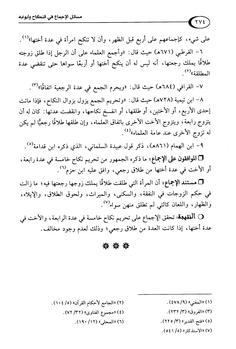 • الموافقون على الإجماع: ما ذكره الجمهور من تحريم نكاح خامسة في عدة رابعة، أو الأخت في عدة أختها من طلاق رجعي، وافق عليه ابن حزم (¬6).