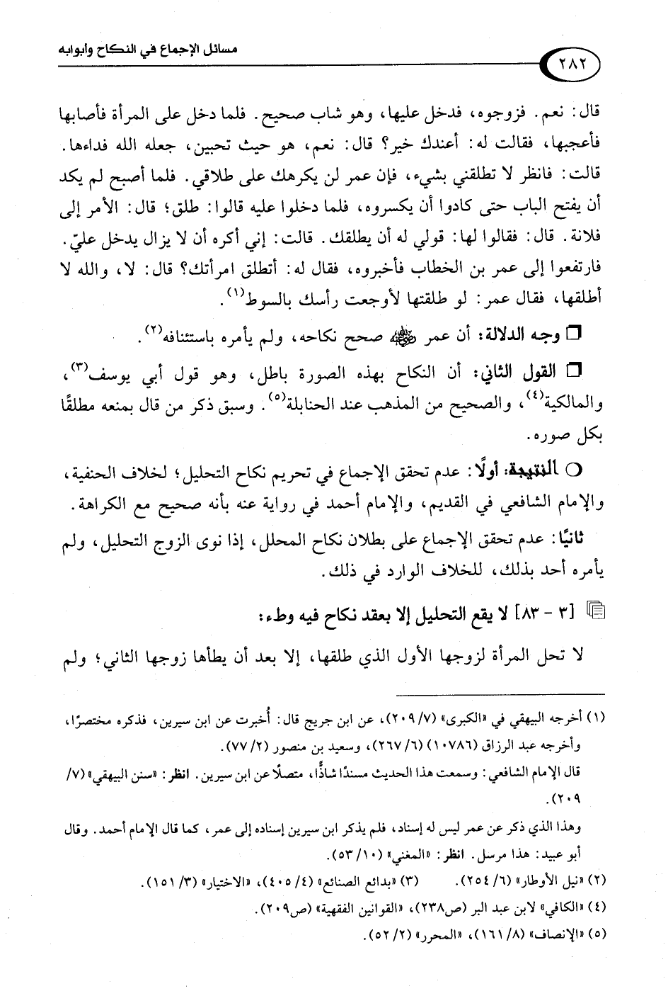 • القول الثاني: أن النكاح بهذه الصورة باطل، وهو قول أبي يوسف (¬3)، والمالكية (¬4)، والصحيح من المذهب عند الحنابلة (¬5). وسبق ذكر من قال بمنعه مطلقًا بكل صوره.Rأولًا: عدم تحقق الإجماع في تحريم نكاح التحليل؛ لخلاف الحنفية، والإمام الشافعي في القديم، والإمام أحمد في رواية عنه بأنه صحيح مع الكراهة.