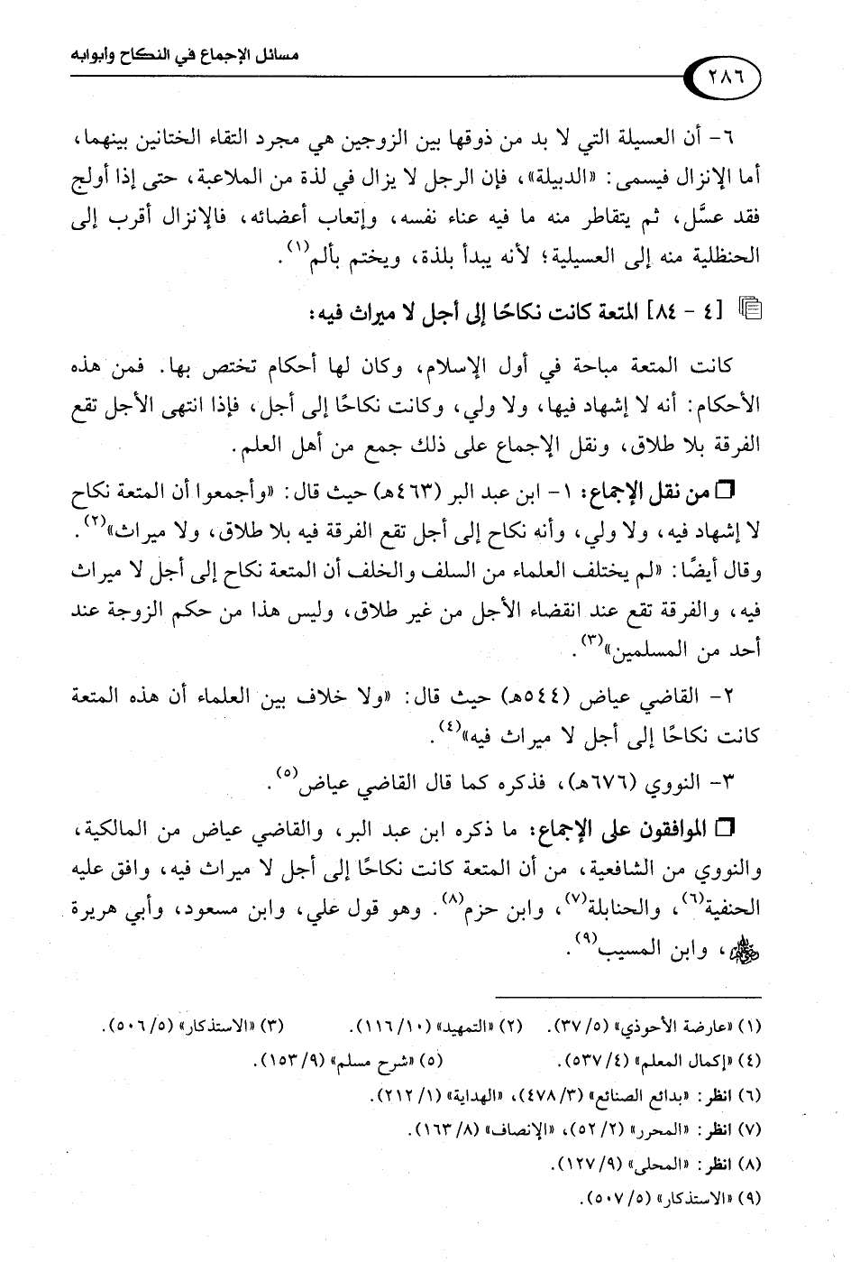 1 - ابن عبد البر (463 هـ) حيث قال: "وأجمعوا أن المتعة نكاح لا إشهاد فيه، ولا ولي، وأنه نكاح إلى أجل تقع الفرقة فيه بلا طلاق، ولا ميراث" (¬2).