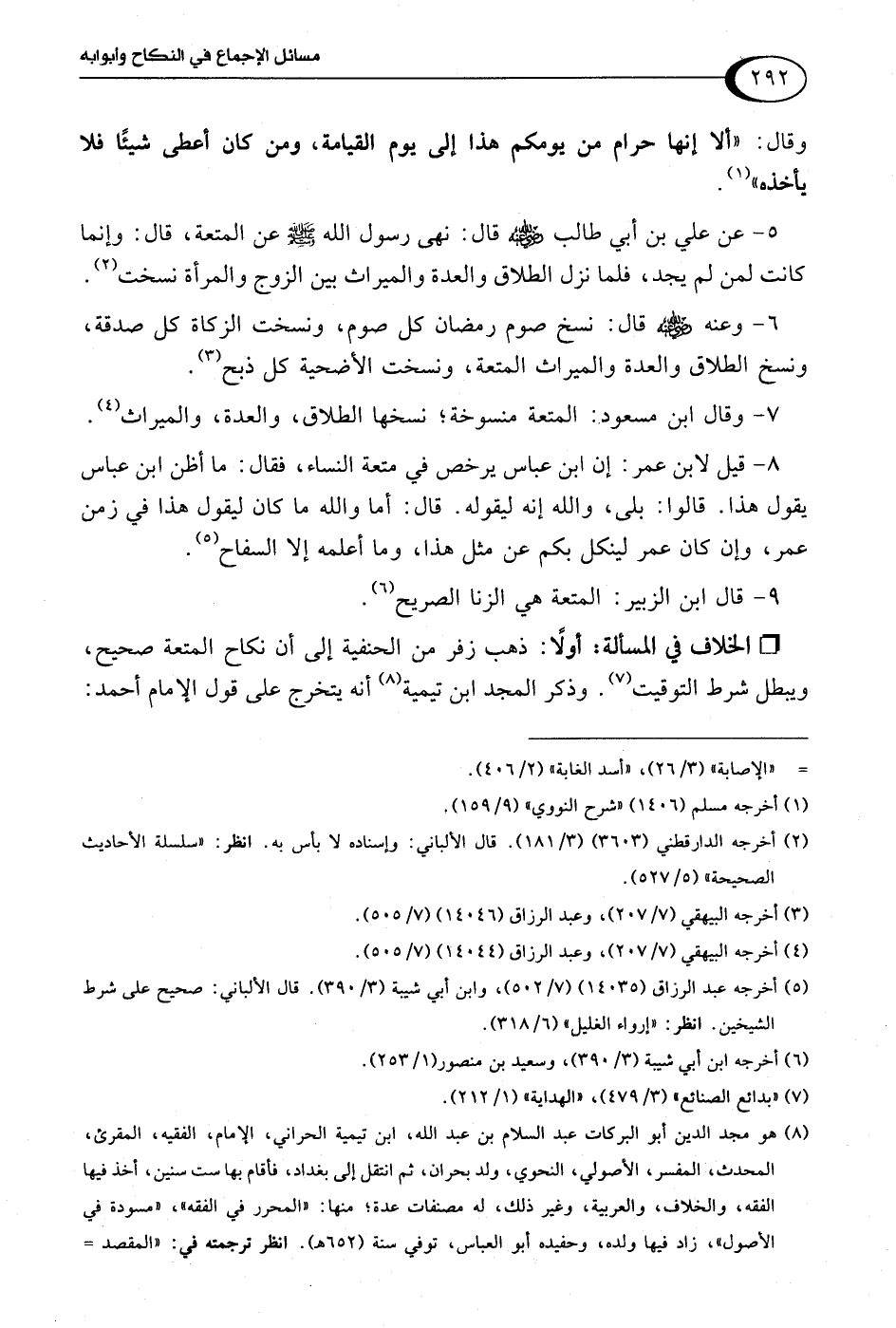 • الخلاف في المسألة: أولًا: ذهب زفر من الحنفية إلى أن نكاح المتعة صحيح، ويبطل شرط التوقيت (¬7). وذكر المجد ابن تيمية (¬8) أنه يتخرج على قول الإمام أحمد: