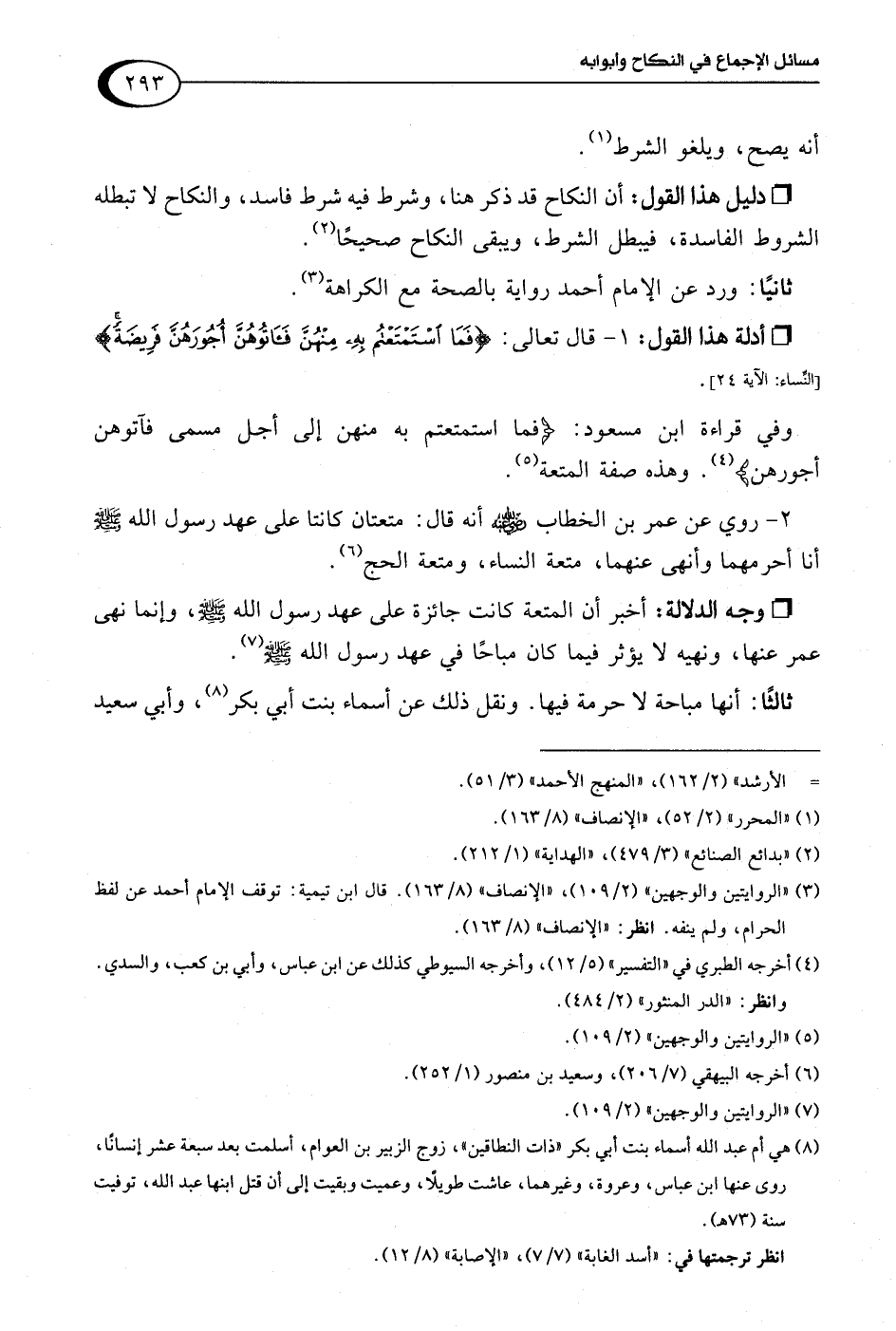 • دليل هذا القول: أن النكاح قد ذكر هنا، وشرط فيه شرط فاسد، والنكاح لا تبطله الشروط الفاسدة، فيبطل الشرط، ويبقى النكاح صحيحًا (¬2).