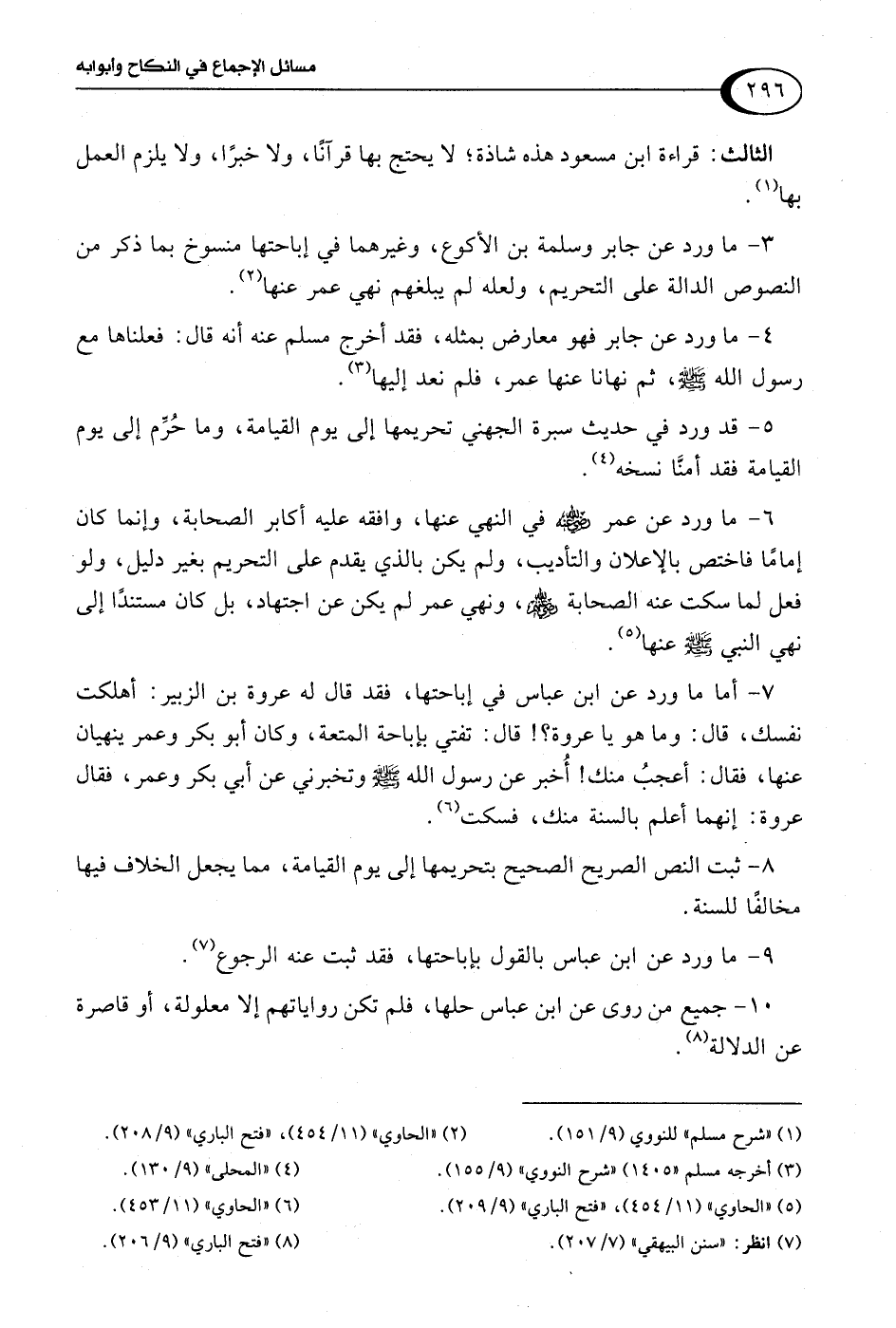3 - ما ورد عن جابر وسلمة بن الأكوع، وغيرهما في إباحتها منسوخ بما ذكر من النصوص الدالة على التحريم، ولعله لم يبلغهم نهي عمر عنها (¬2).