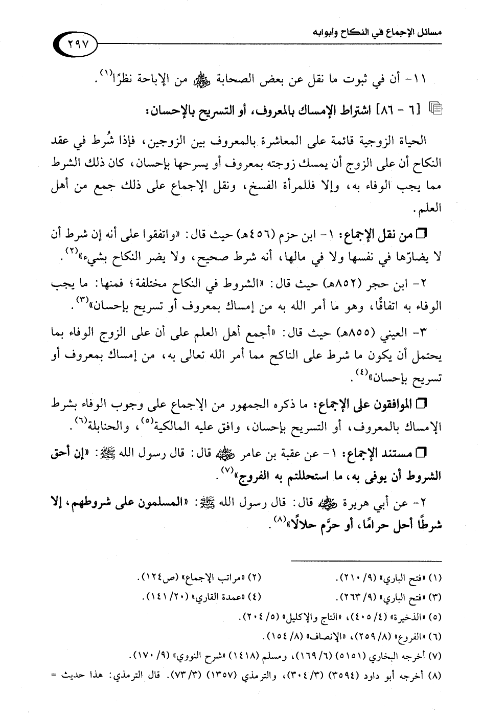 2 - ابن حجر (852 هـ) حيث قال: "الشروط في النكاح مختلفة؛ فمنها: ما يجب الوفاء به اتفاقًا، وهو ما أمر اللَّه به من إمساك بمعروف أو تسريح بإحسان" (¬3).