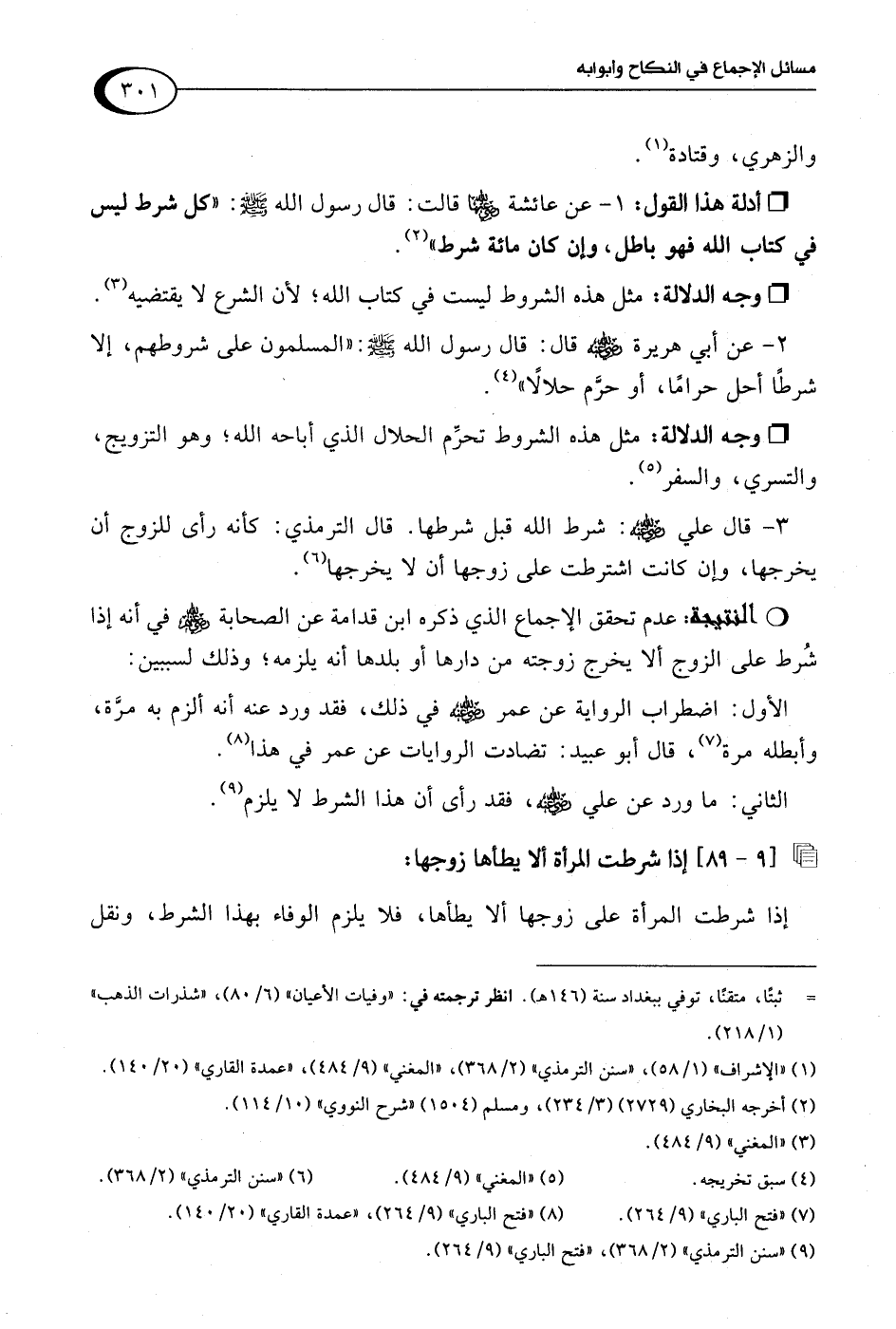 3 - قال علي -رضي اللَّه عنه-: شرط اللَّه قبل شرطها. قال الترمذي: كأنه رأى للزوج أن يخرجها، وإن كانت اشترطت على زوجها أن لا يخرجها (¬6).Rعدم تحقق الإجماع الذي ذكره ابن قدامة عن الصحابة -رضي اللَّه عنهم- في أنه إذا شُرط على الزوج ألا يخرج زوجته من دارها أو بلدها أنه يلزمه؛ وذلك لسببين: