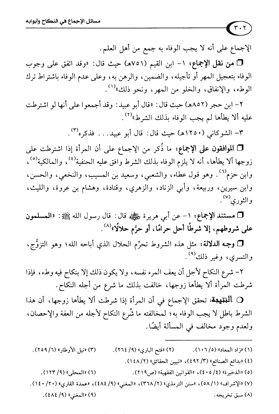 1 - ابن القيم (751 هـ) حيث قال: "وقد اتفق على وجوب الوفاء بتعجيل المهر أو تأجيله، والضمين، والرهن به، وعلى عدم الوفاء باشتراط ترك الوطء، والإنفاق، والخلو من المهر، ونحو ذلك" (¬1).