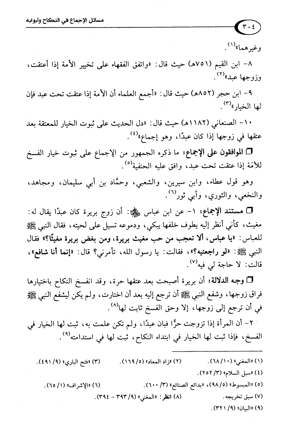 9 - ابن حجر (852 هـ) حيث قال: "أجمع العلماء أن الأمة إذا عتقت تحت عبد فإن لها الخيار" (¬3).