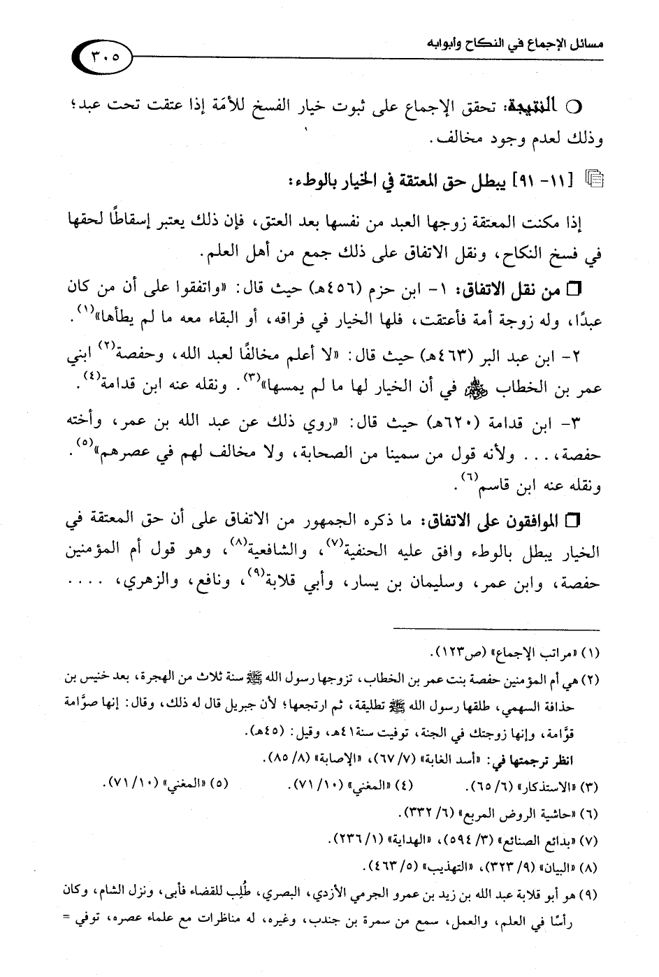 1 - ابن حزم (456 هـ) حيث قال: "واتفقوا على أن من كان عبدًا، وله زوجة أمة فأعتقت، فلها الخيار في فراقه، أو البقاء معه ما لم يطأها" (¬1).