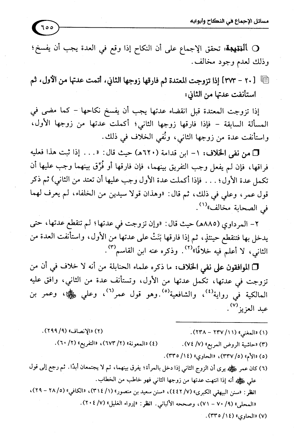 1 - ابن قدامة (620 هـ) حيث قال: ". . . إذا ثبت هذا فعليه فراقها، فإن لم يفعل وجب التفريق بينهما، فإن فارقها أو فُرِّق بينهما وجب عليها أن تكمل عدة الأول؛ . . . فإذا أكملت عدة الأول وجب عليها أن تعتد من الثاني) ثم ذكر قول عمر، وعلى في ذلك، ثم قال: "وهذان قولا سيدين من الخلفاء، لم يعرف لهما في الصحابة مخالف" (¬1).