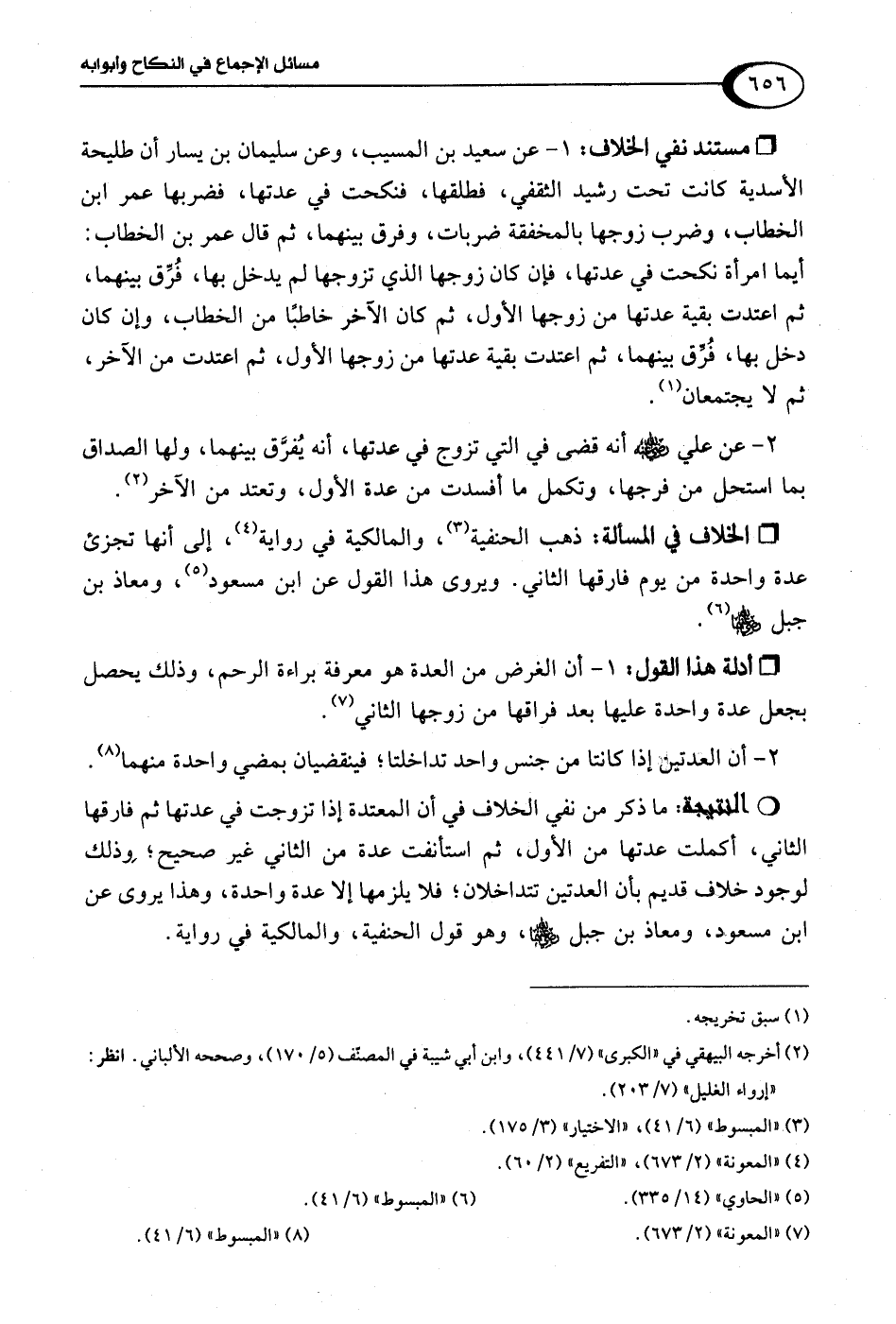 2 - أن العدتين إذا كانتا من جنس واحد تداخلتا؛ فينقضيان بمضي واحدة منهما (¬8).Rما ذكر من نفي الخلاف في أن المعتدة إذا تزوجت في عدتها ثم فارقها الثاني، أكملت عدتها من الأول، ثم استأنفت عدة من الثاني غير صحيح؛ وذلك لوجود خلاف قديم بأن العدتين تتداخلان؛ فلا يلزمها إلا عدة واحدة، وهذا يروى عن ابن مسعود، ومعاذ بن جبل، وهو قول الحنفية، والمالكية في رواية.