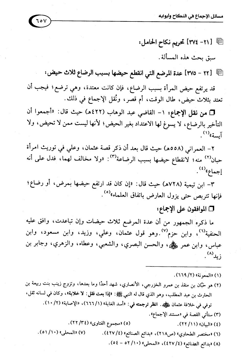 2 - العمراني (558 هـ) حيث قال بعد أن ذكر قصة عثمان، وعلى في توريث امرأة حبان (¬2) منه؛ لانقطاع حيضها بسبب الرضاعة (¬3): "ولا مخالف لهما، فدل على أنه إجماع" (¬4).