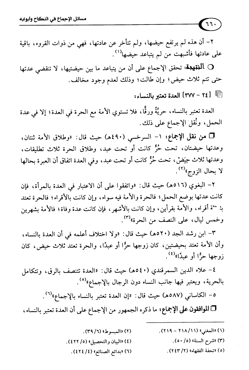 5 - الكاساني (587 هـ) حيث قال: "إن العدة تعتبر بالنساء بالإجماع" (¬6).
