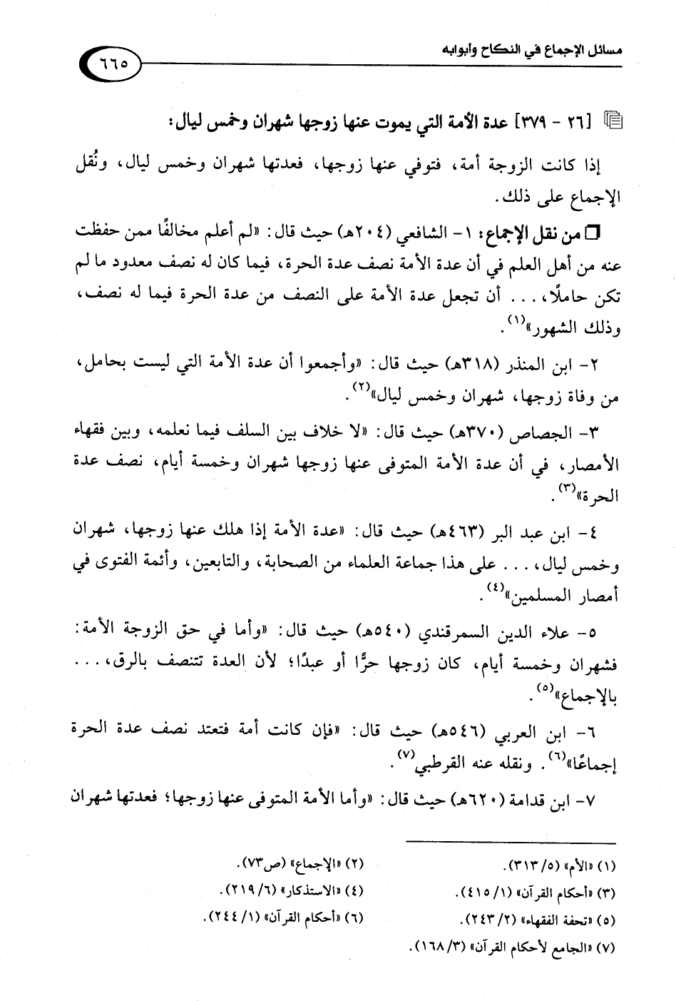 4 - ابن عبد البر (463 هـ) حيث قال: "عدة الأمة إذا هلك عنها زوجها، شهران وخمس ليال، . . . على هذا جماعة العلماء من الصحابة، والتابعين، وأئمة الفتوى في أمصار المسلمين" (¬4).