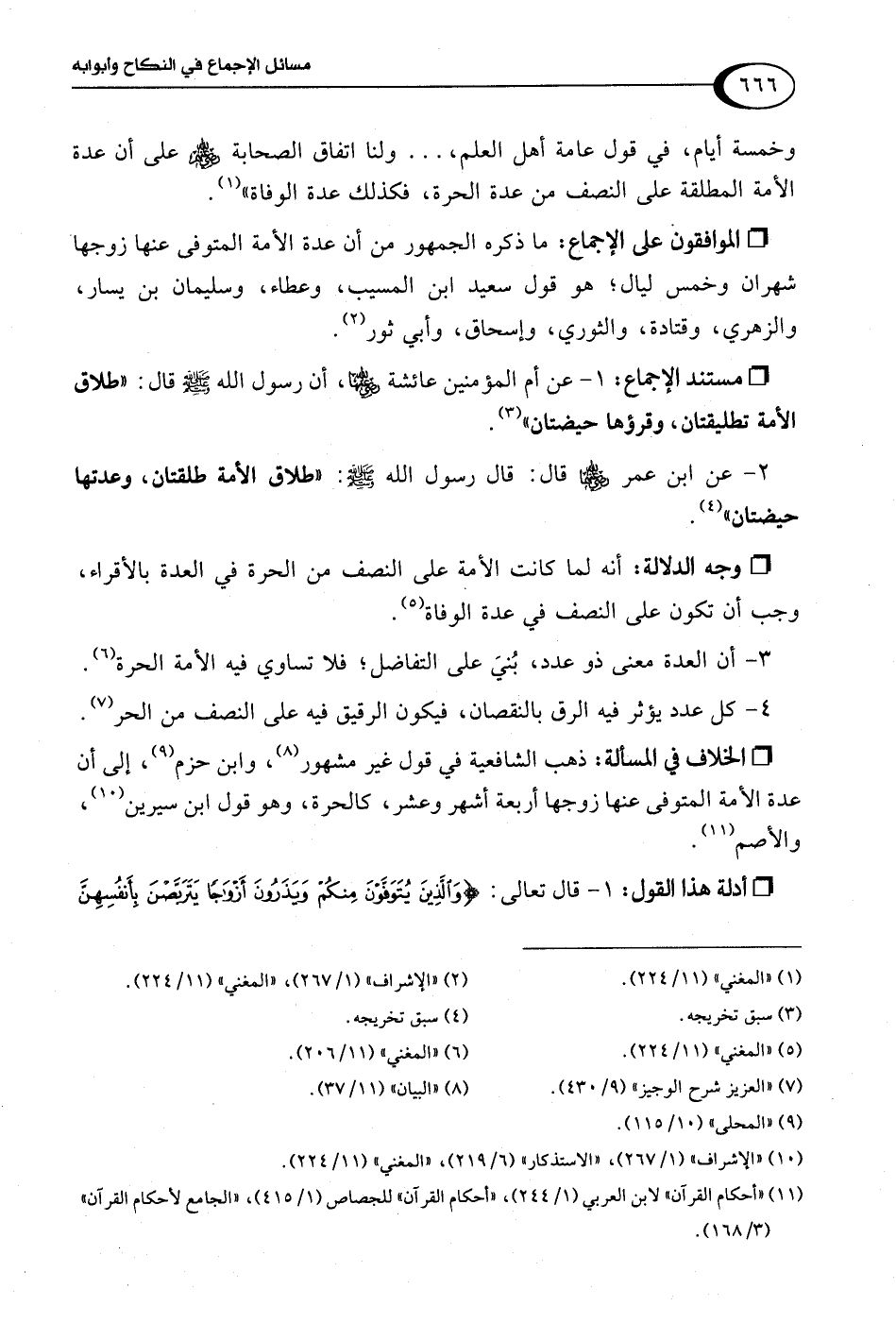 • الموافقون على الإجماع: ما ذكره الجمهور من أن عدة الأمة المتوفى عنها زوجها شهران وخمس ليال؛ هو قول سعيد ابن المسيب، وعطاء، وسليمان بن يسار، والزهري، وقتادة، والثوري، وإسحاق، وأبي ثور (¬2).
