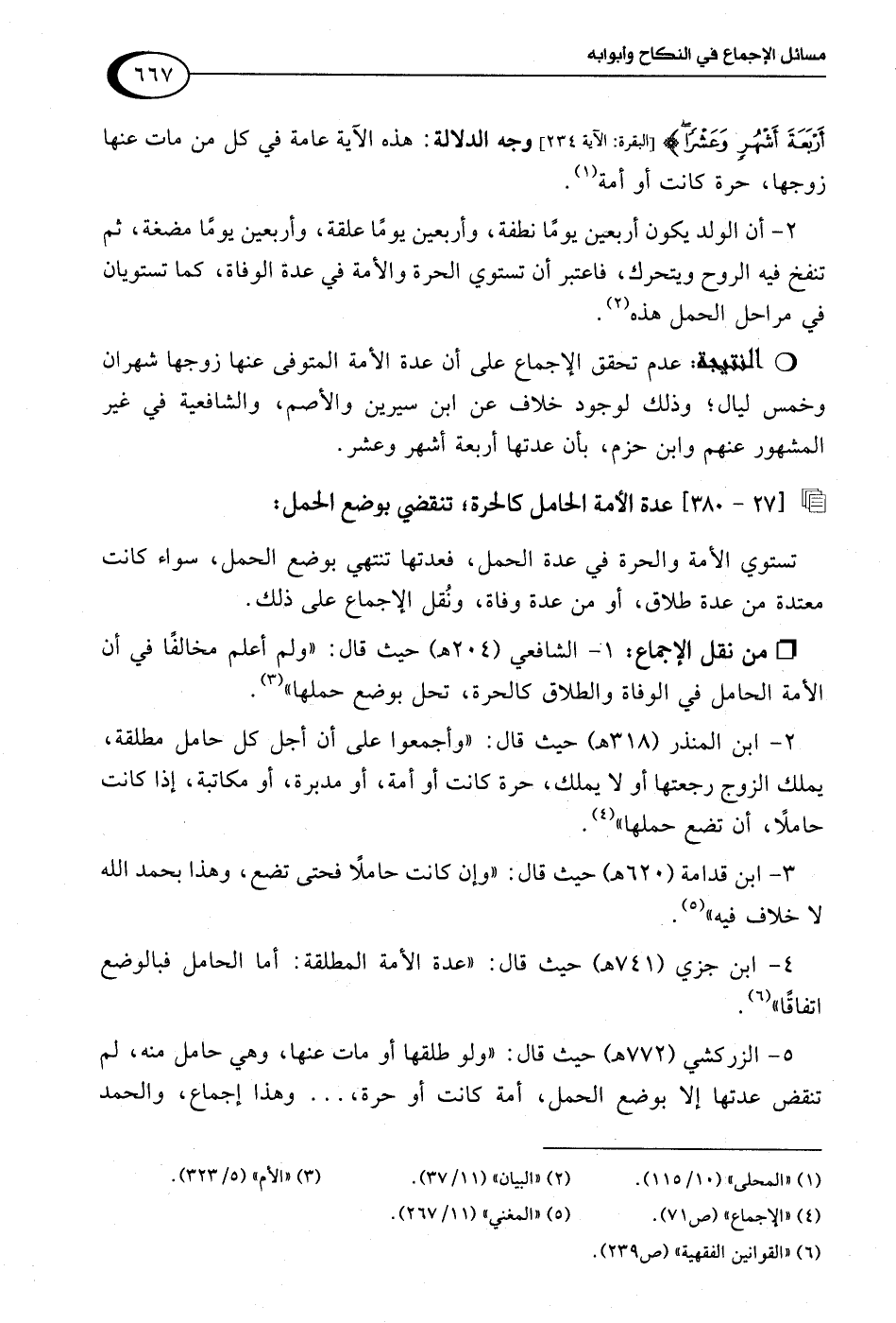 5 - الزركشي (772 هـ) حيث قال: "ولو طلقها أو مات عنها، وهي حامل منه، لم تنقض عدتها إلا بوضع الحمل، أمة كانت أو حرة، . . . وهذا إجماع، والحمد