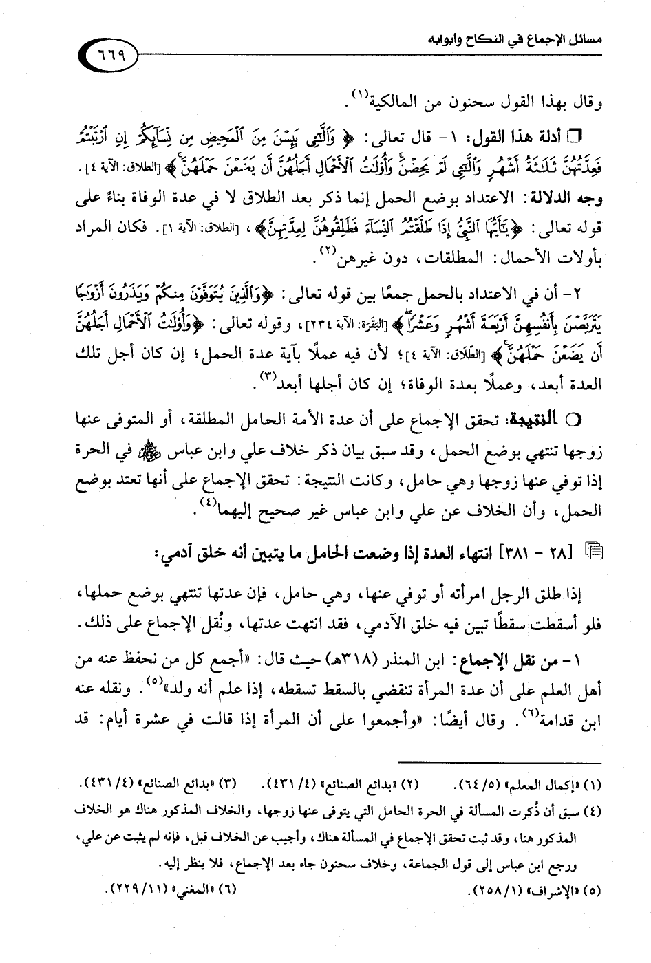 2 - أن في الاعتداد بالحمل جمعًا بين قوله تعالى: {وَالَّذِينَ يُتَوَفَّوْنَ مِنْكُمْ وَيَذَرُونَ أَزْوَاجًا يَتَرَبَّصْنَ بِأَنْفُسِهِنَّ أَرْبَعَةَ أَشْهُرٍ وَعَشْرًا} [البقرة: الآية 234] وقوله تعالى: {وَأُولَاتُ الْأَحْمَالِ أَجَلُهُنَّ أَنْ يَضَعْنَ حَمْلَهُنَّ} [الطلاق: الآية 4]؛ لأن فيه عملًا بآية عدة الحمل؛ إن كان أجل تلك العدة أبعد، وعملًا بعدة الوفاة؛ إن كان أجلها أبعد (¬3).Rتحقق الإجماع على أن عدة الأمة الحامل المطلقة، أو المتوفى عنها زوجها تنتهي بوضع الحمل، وقد سبق بيان ذكر خلاف على وابن عباس -رضي اللَّه عنهم- في الحرة إذا توفي عنها زوجها وهي حامل، وكانتRتحقق الإجماع على أنها تعتد بوضع الحمل، وأن الخلاف عن علي وابن عباس غير صحيح إليهما (¬4).