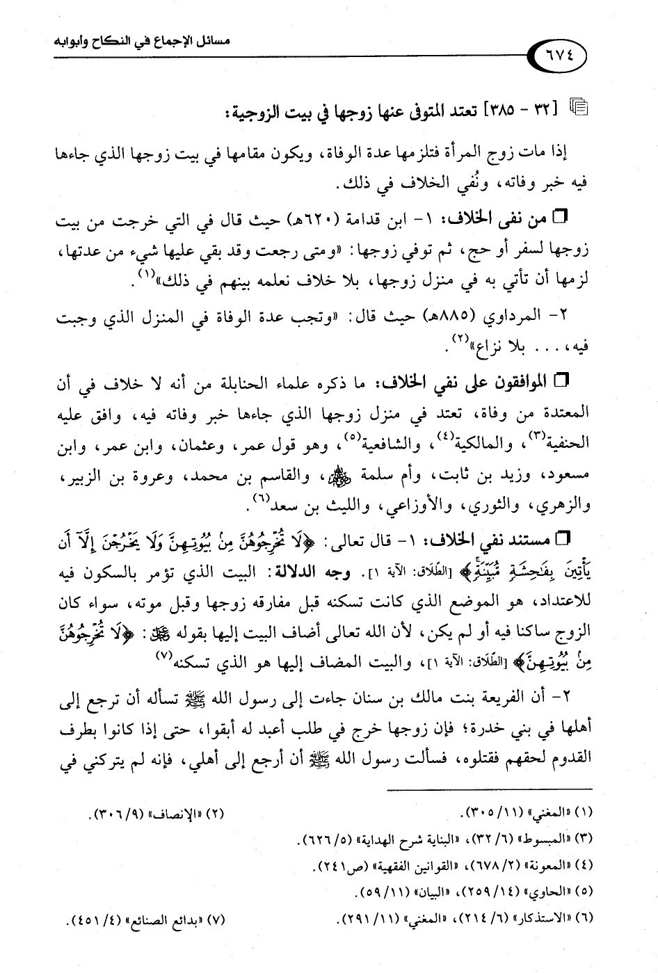 2 - المرداوي (885 هـ) حيث قال: "وتجب عدة الوفاة في المنزل الذي وجبت فيه، . . . بلا نزاع" (¬2).
