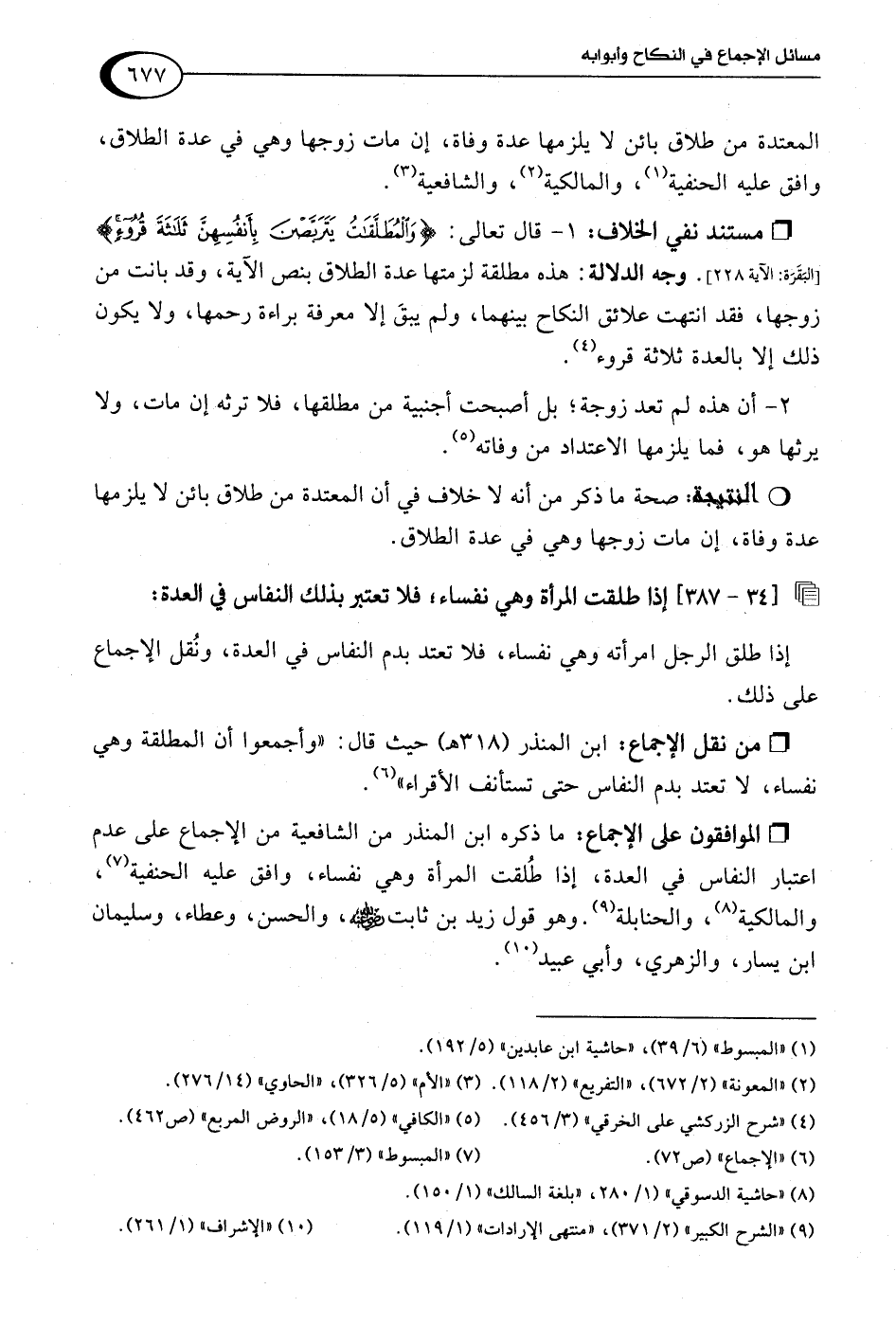 • من نقل الإجماع: ابن المنذر (318 هـ) حيث قال: "وأجمعوا أن المطلقة وهي نفساء، لا تعتد بدم النفاس حتى تستأنف الأقراء" (¬6).