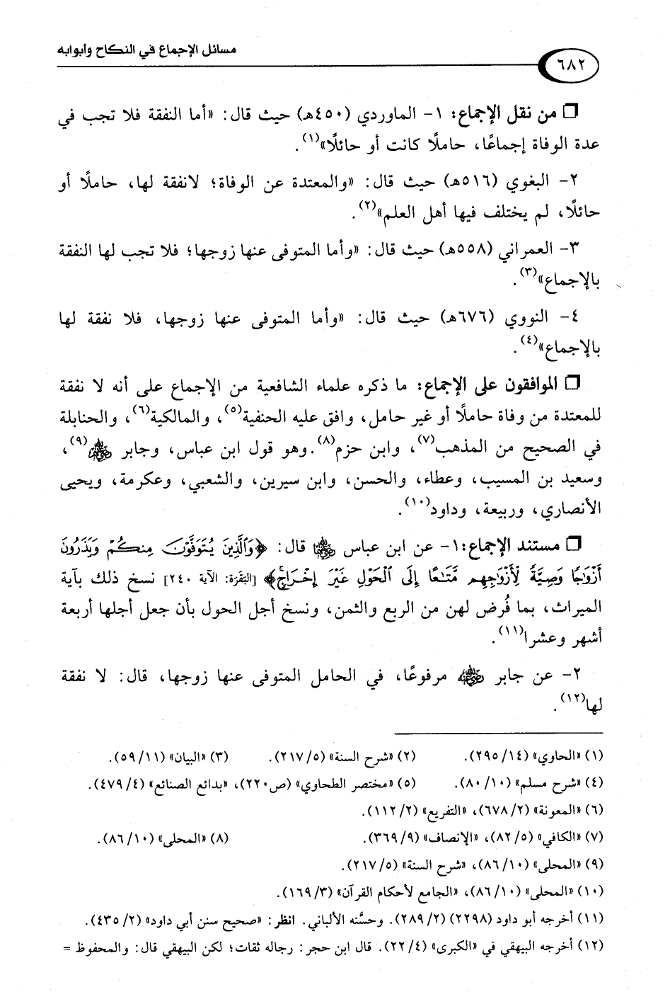 • الموافقون على الإجماع: ما ذكره علماء الشافعية من الإجماع على أنه لا نفقة للمعتدة من وفاة حاملًا أو غير حامل، وافق عليه الحنفية (¬5)، والمالكية (¬6)، والحنابلة في الصحيح من المذهب (¬7)، وابن حزم (¬8).