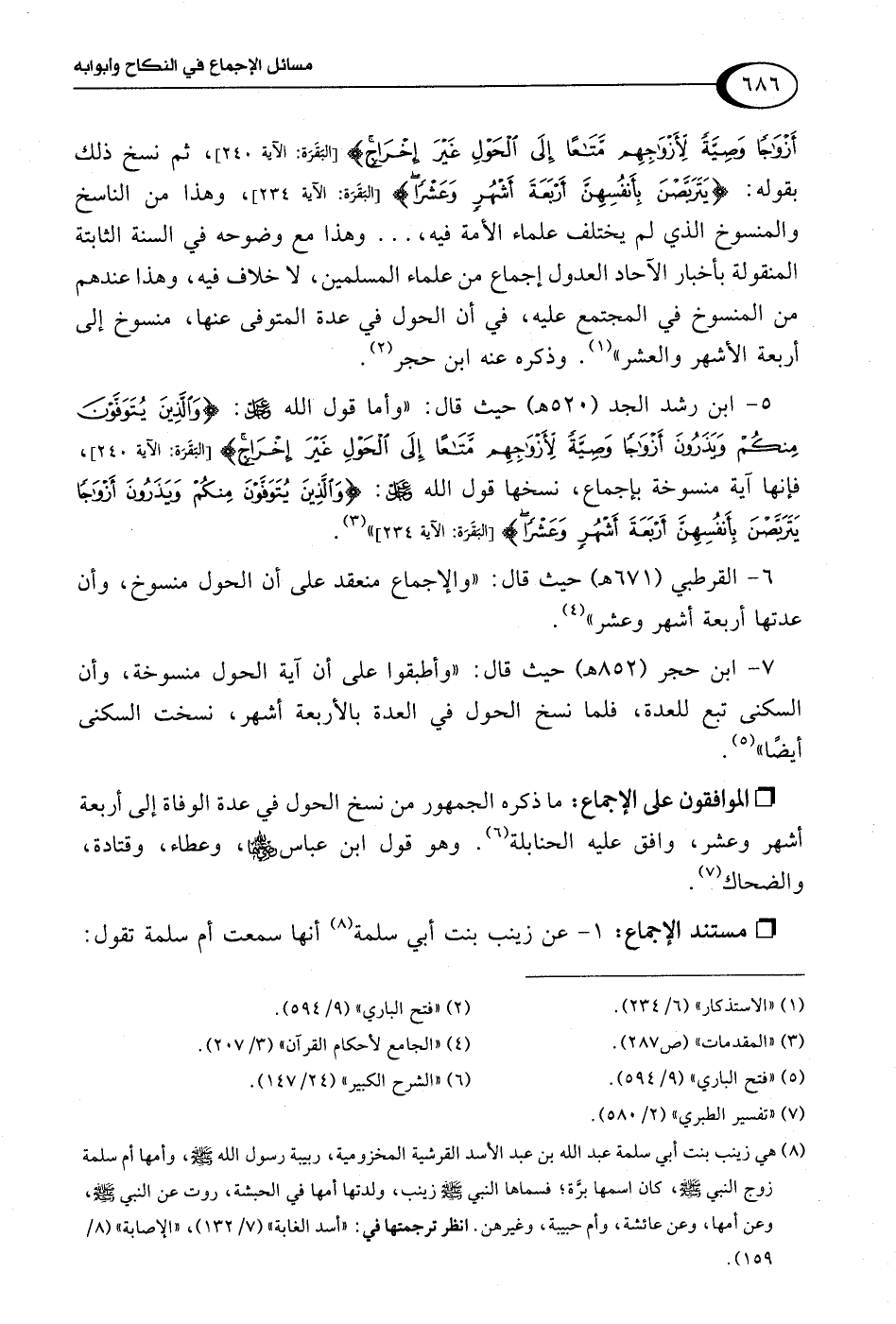 6 - القرطبي (671 هـ) حيث قال: "والإجماع منعقد على أن الحول منسوخ، وأن عدتها أربعة أشهر وعشر" (¬4).